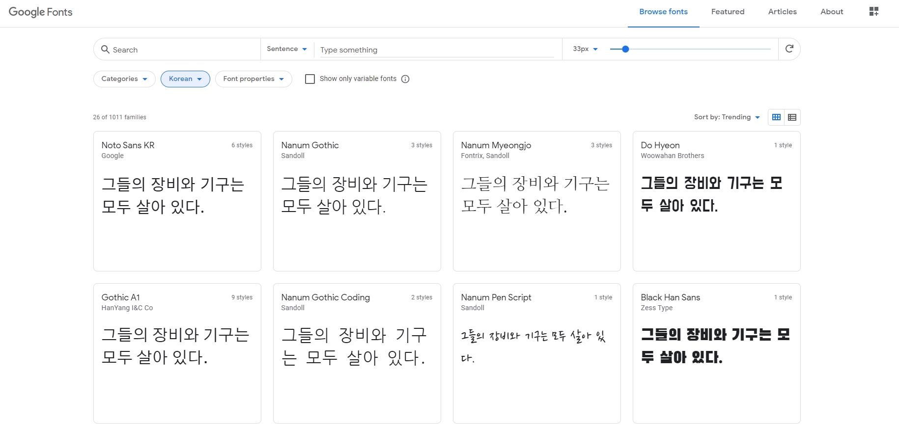 2. 사용 언어를 한국어 (korean) 으로 설정하면 사용가능한 웹폰트 리스트가 나온다.