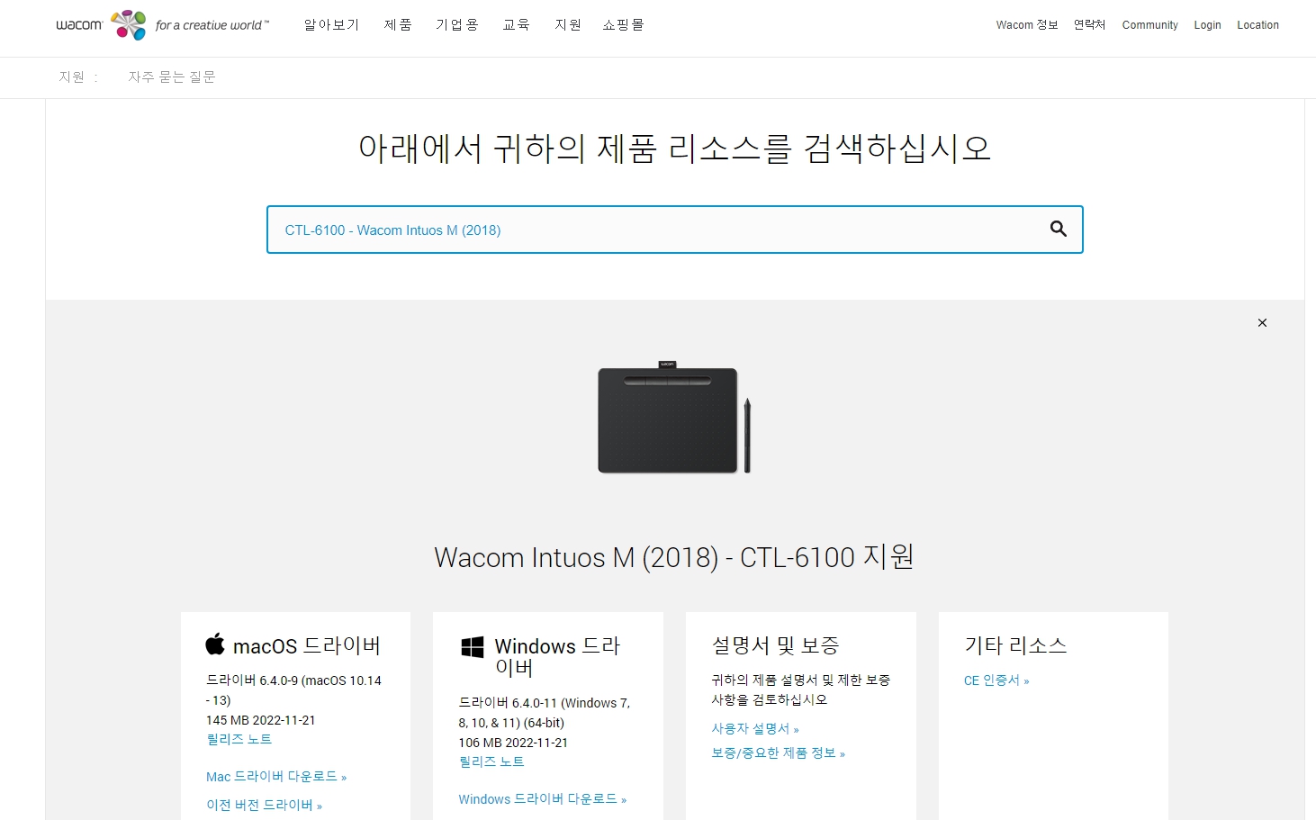 제품 드라이버 다운로드 하기 : https://www.wacom.com/ko-kr/support/product-support/drivers