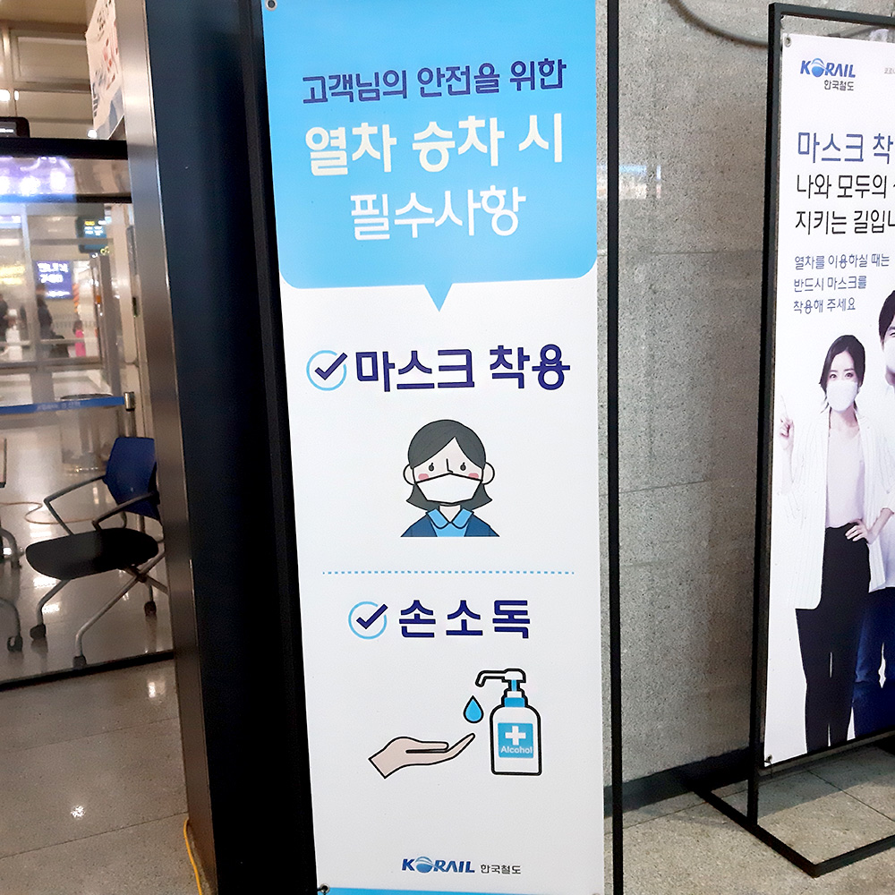 용산역 지하철 입구에 마스크 필수 스탠드 배너가 보였다.