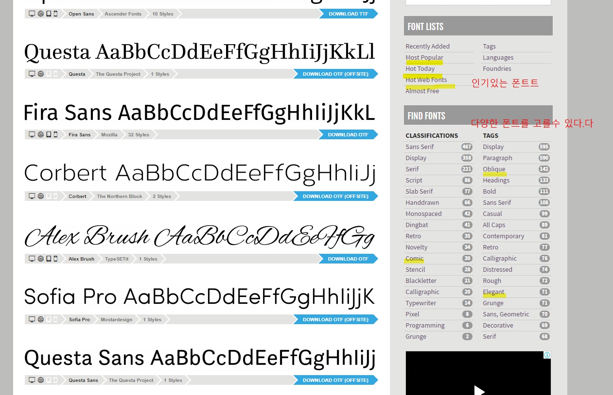 인기있는 폰트 와 다양한 스타일의 폰트를 선택할 수 있다.
